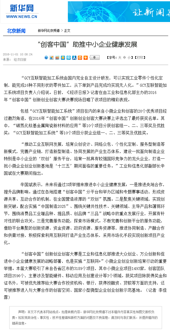 2016年10月,由國家工信部舉辦的“創(chuàng)客中國”大賽中,“GCY互聯(lián)智能加工系統(tǒng)”在全國三千多個項目中獲得前八名,在智能制造領(lǐng)域獲得第一,該賽事被“經(jīng)濟日報”、“廣州日報”、“新華網(wǎng)”、“鳳凰網(wǎng)”等全國眾多媒體報道。